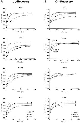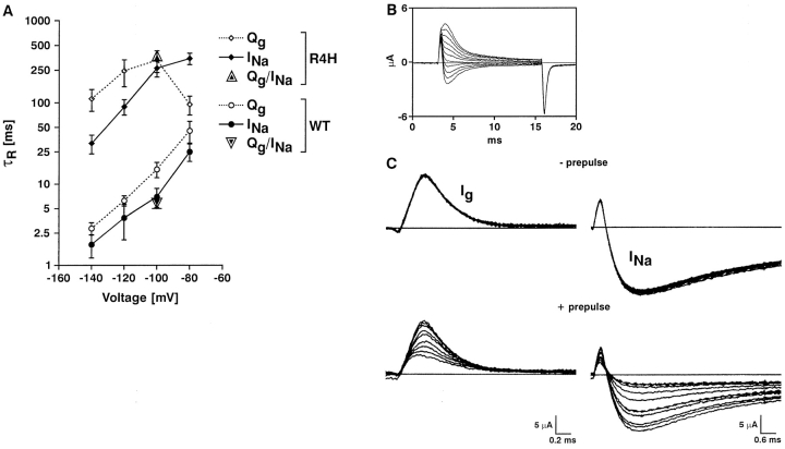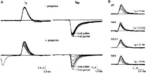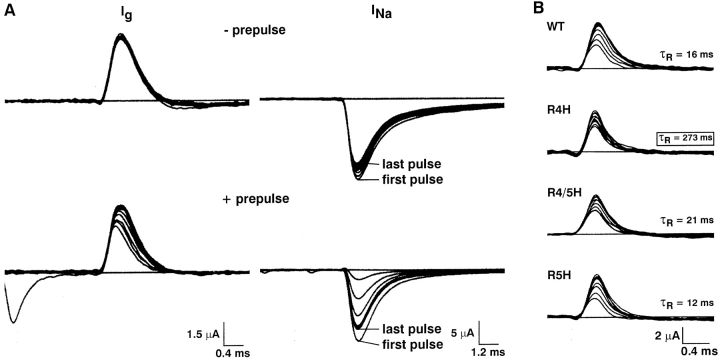 Figure 5. Recovery from fast inactivation of macroscopic ionic and gating currents. (A) Recovery of WT gating current (Ig, in the presence of 2 μM TTX) and ionic current (INa, in the absence of TTX) obtained from different oocytes. Pulse protocol: a 100-ms prepulse to 0 mV from a holding potential of −100 mV was followed by a recovery period of variable duration (2–90 ms) at −100 mV. Test pulses have a duration of 80 ms (ionic current) or 13 ms (gating current) and responses are superimposed for all recovery periods. For the calculation of the recovery time course, the current traces with prepulse were routinely normalized to the current traces without prepulse in order to compensate the slight decrease of the current amplitude during pulse series. The series of increasing recovery times, starting from 2 ms, where INa is almost totally inactivated, was preceded by the longest recovery time where the plateau of recovery is observed (first and last pulses are indicated in INa recordings). (B) Gating current recovery of WT and mutant sodium channels at −100 mV. Pulse protocol was as described above. The time intervals for recovery were between 10 and 1,250 ms for R4H and between 2 and 90 ms for WT and the other mutant channels. The recovering gating charges were fitted to a single exponential with corresponding recovery time constants (τR) as indicated. Notice the different levels of the nonimmobilized gating current fraction at the onset of recovery, reflecting the different degrees of immobilization.
