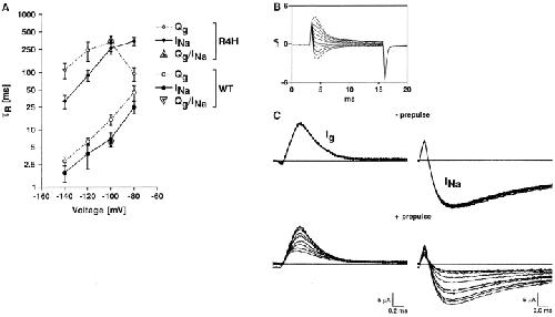 Figure 7. Correlation of the recovery of ionic current and gating charge of WT and R4H at different potentials. (A) Semilogarithmic plot of ionic current (filled symbols) and gating charge (open symbols) recoveries obtained from different oocytes are superimposed for potentials of −140, −120, −100, and −80 mV. Values are mean ± SD of n > 3 cells. Superimposed triangles represent congruent data of ionic current (small, filled triangle) and gating charge recovery (large, open triangle) recorded sequentially in a single oocyte at −100 mV. (B) Simultaneous recording of ionic and gating currents around sodium reversal potential (ENa). Test pulses elicited from +5 to +15 mV in steps of 1 mV, holding potential −100 mV. Extracellular sodium concentration was reduced to 8.8 mM by choline replacement in Modified Barth's Solution. Ionic currents change polarity when crossing ENa, whereas gating currents follow the direction of the electric field. (C) Recordings of gating current and ionic current recovery at sodium reversal potential (ENa) obtained from a single oocyte, T = 8°C. Pulse-protocol: a 20 ms prepulse to 40 mV was followed by a recovery period of variable duration (1–60 ms) at −100 mV and a test pulse to −20 (ionic current) or 34 mV (ENa; gating current), test pulse duration 13 ms, holding potential −100 mV.