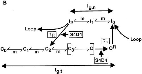 Figure 8. Model of sodium channel fast inactivation controlled by S4D4. (A) Schematic illustration of our interpretations and conclusions displaying the relevant structures of the sodium channel and their movements at closed, open, and inactivated states as well as during recovery from inactivation. The positively charged amino acids of the S4 voltage sensors in domains 2–4 and the analyzed mutations in S4D4 are indicated. R symbolizes the putative receptor site in the S4–S5 linker of domain 4, which binds the docking region (D) of the inactivation loop connecting domains 3 and 4 (L3–4), leading to fast inactivation of the channel. Moreover, the position of L3–4 during inactivation causes the partial immobilization of the voltage sensors (most probably S4D4 and S4D3; see discussion), which is indicated here as blockade of m by B. (B) State diagram with lower level reflecting the voltage-dependent activation pathway from several closed (C) to the open state (O) and further to the open state (OR), which presents the receptor instantly followed by the voltage-independent binding of L3–4. The upper level reflects the transitions between several inactivated states producing the nonimmobilized gating current fraction. For recovery from fast inactivation, hyperpolarization causes the reverse movement of S4D4, which disrupts the connection of the inactivation loop to its receptor and simultaneously causes the partial immobilization of the voltage sensors, thereby permitting the return of the channels into the resting (closed) state.