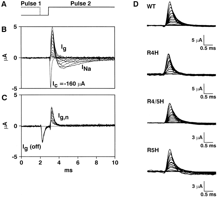Figure 3. Gating current recordings in WT and mutant sodium channels. (A–D) Sodium ionic (INa) and gating (Ig) currents recorded from the whole cell membrane of Xenopus oocytes using a TEVC after blocking most (B and C) or all (D) of the ionic current with TTX. (A) Pulse protocol; the traces were elicited by 13 ms depolarizing test pulses to membrane potentials of −60 to 60 mV increasing in steps of 10 mV without (B) or with (C) a 20-ms prepulse to 0 mV from a holding potential of −100 mV, interval 1 ms at −100 mV, temperature 15°C. The OFF-gating current of the prepulse and the non-immobilized fraction of the test pulse ON-gating current (Ig,n) are indicated in C. Notice the elimination of INa and the partial immobilization (∼50%) of total gating current (Ig) due to the inactivating pulse. The corresponding capacitance current (Ic) reflects the actual clamp speed. (D) Total ON-gating currents of WT and mutant channels activated by step depolarizations in 20-mV increments from −80 to 80 mV from a holding potential of −100 mV, recorded in presence of 2 μM TTX, pulse duration 13 ms.