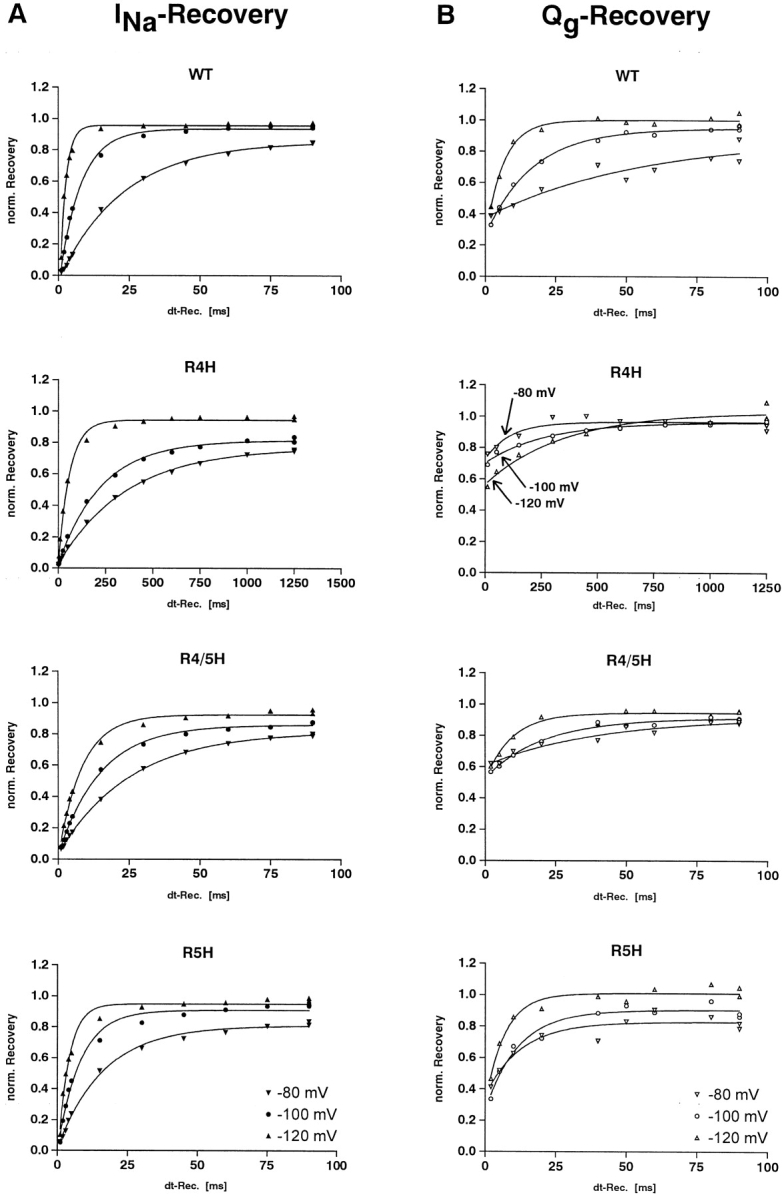 Figure 6. Comparison of the recovery of ionic current and gating charge of WT and mutant sodium channels at different potentials. Sodium current recovery (left panel) and gating charge recovery (right panel) at recovery potentials of −80, −100, and −120 mV in WT-, R4H-, R4/5H-, and R5H-sodium channels. The data of each subdiagram were recorded from different oocytes and normalized as described in Fig. 5. Notice the different starting points of gating current recovery in R4H that strictly depend on the effective recovery potential (indicated by arrows). Corresponding sodium current (INa) and gating charge (Qg) recovery time constants obtained from single exponential fits are as follows (INa/Qg in ms): WT, 22.8/54.9 (−80 mV), 7.6/16.7 (−100 mV), 2.1/6.4 (−120 mV); R4H, 359/113 (−80 mV), 228/269 (−100 mV), 59.7/349 (−120 mV); R4/5H, 25.4/39.7 (−80 mV), 14.9/20.6 (−100 mV), 8.4/9.5 (−120 mV); R5H, 16.3/12.6 (−80 mV), 8.0/11.6 (−100 mV), 3.8/6.9 (−120 mV).