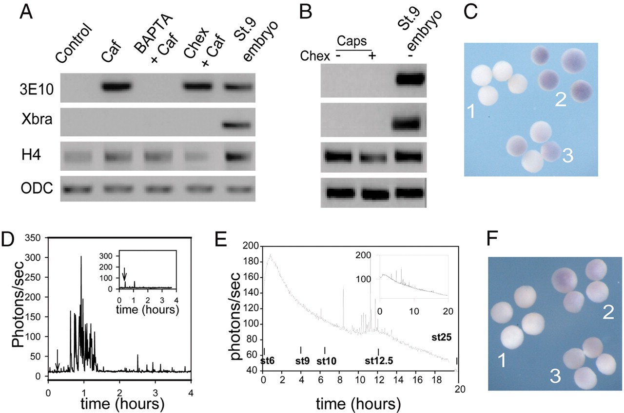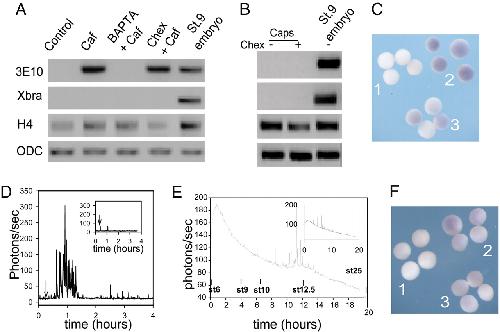 Fig. 1. xPRMT1b expression is induced by Ca2+ increase and by BMP inhibition. (A) ACs excised at stage 8 and treated with 10 mM caffeine for 30 min (Caf) were preincubated for 30 min with BAPTA-AM (20 μM) (Bapta+Caf), or in the presence of cycloheximide (chex+Caf). All ACs were cultured to stage 9. Expression of xPRMT1b, histone H4, and Xbra was analyzed by RT-PCR. Control, untreated AC. RNA from stage 9 embryo was used as positive control. The ubiquitous enzyme, ODC (ornithine decarboxylase), was used as loading control. (B) ACs were treated with cycloheximide (10 μg/ml) for 30 min. Neither xPRMT1b nor Xbra are induced. (C) ACs from stage 8 embryos were either treated with conditioned medium containing noggin protein (2) or preincubated for 30 min with BAPTA-AM (20 μM) before addition of noggin (3); control AC is also shown (1). ISH was performed with xPRMT1b probe. All ACs were cultured to stage 9. (D) Light emission within three ACs dissected at stage 8. Aequorin was injected at two-cell stage in each blastomere. An increase in light emission, reflecting an increasein[Ca2+]i, was recorded. (Inset) The ACs were preincubated for 30 min with 300 μM nifedipine. No significant variation of [Ca2+]i was recorded. Arrows indicate the addition of noggin (1 μg/ml). (E) Light emission within a typical embryo injected with tBR (1 ng total) and aequorin in the two ventral blastomeres at four-cell stage. Recording starts at stage 6. An increase in light emission reflecting an increase in [Ca2+]i was recorded. (Inset) tBR-injected embryo treated with 20 μM BAPTA during the whole recording. (F) Whole-mount ISH of AC with xPRMT1b probe. ACs were dissected at stage 8 from embryos injected with tBR RNA and cultured to stage 10.5. tBR-injected AC (2), tBR-injected AC treated with 20 μM BAPTA-AM (3), and control AC (1) are shown.