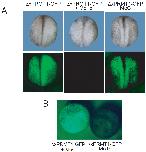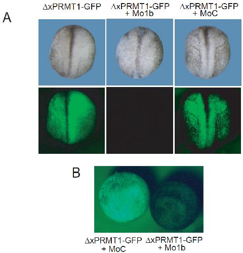 Fig.7. Specificity of xPRMT1b Mo using r-xPRMT-GFP mRNA in vivo. (A). Neurula stage embryos injected into two cells at the two-cell stage with 3.2 ng of capped mRNA (Left) or along with either 12.5 ng of Mo1b (Center) or MoC (Right). Mo1b totally abolishes GFP translation (Lower Center), whereas MoC has no effect (Lower Right). (B) Embryos (stage 13) injected into two cells at the two-cell stage with 3.2 ng of capped mRNA with either 6.25 ng of MoC or Mo1b. Mo1b (Right) totally abolishes GFP translation while MoC (Left) has no effect.