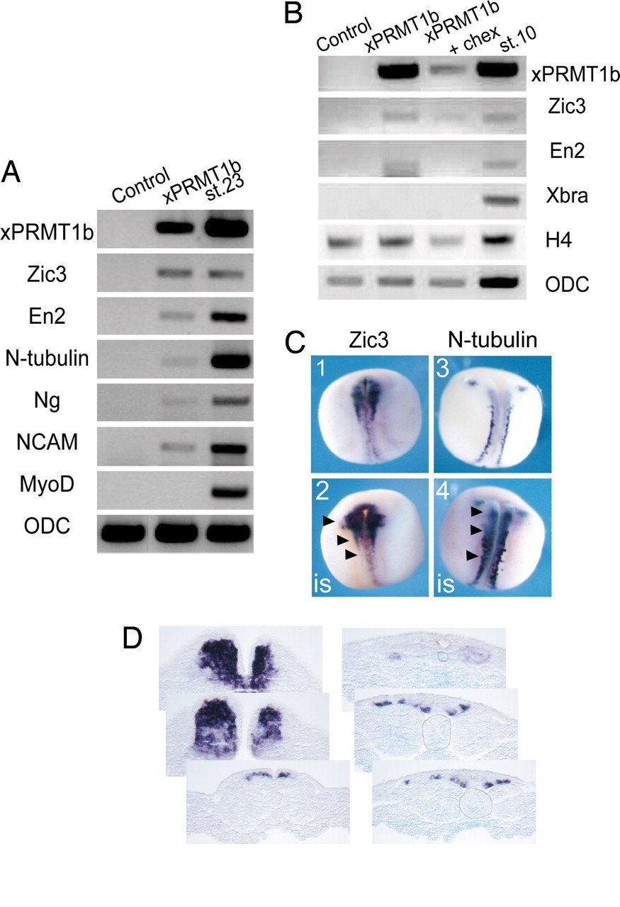 Fig. 3. xPRMT1b induces neural markers in AC and in the whole embryo. (A and B) RT-PCR analysis of xPRMT1b-injected AC. Two-cell stage embryos were injected with xPRMT1b RNA (2 ng total). (A) ACs were excised at stage 8 and cultured to stage 23. Zic3, En2, Neurogenin (Ng), N-CAM, and N-tubulin were induced, whereas MyoD was not. (B) ACs were cultured to stage 10 in the presence or absence of cycloheximide (10 μg/ml). The expression of Zic3 was still detected in the presence of cycloheximide (xPRMT1b+chex), whereas En2 was not. Note that Xbra is not expressed. RNA from whole embryos of stages 10 and 23 and the corresponding ACs were used as controls. (C) One cell of two-cell-stage embryo was injected with xPRMT1b RNA (2 ng total). ISH was performed on neurula for Zic3 (Left) and N-tubulin (Right) (1 and 3), and control uninjected embryos are shown (2 and 4). Zic3 and N-tubulin expressions are expanded on the injected side. Arrowheads indicate the position of sections on D.(D) Three typical cross sections from the anterior to the posterior part of the embryos displayed in C (dorsal side up). These sections confirm the expansion of the expression domains. Notochord is encircled; is, injected side.