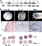 Fig. 2. Temporal and spatial distribution of xPRMT1b RNA expression during embryogenesis. (A) RT-PCR analysis of RNA extracted from oocyte (ovo) and embryos at the indicated stages. (B) Whole-mount ISH analysis of the tissue distribution of xPRMT1b transcripts (1). Stage 10.5, vegetal view (2). Corresponding sagittal section (animal side up, dorsal side to the left) (3). Stage 20, dorsal view (4). Corresponding cross section of the trunk region (dorsal side up) (5). Tailbudembryo, dorsal view (6). Corresponding anterior transverse section. a, anterior; ba, branchial arches; cg, cement gland; d, dorsal; hb, hindbrain; il, inner layer; mb, midbrain; nc, notochord; nt, neural tube; ol, outer layer; ov, optic vesicle; p, posterior; *, dorsal blastopore lip. (C) LTC antagonist represses the expression of xPRMT1b. Embryos were treated from stage 8 to 10 with 300 μM nifedipine. xPRMT1b expression was revealed by ISH (dorsal views, blastopore to the top) at stage 10.5 (Left) and stage 12.5 (Right).