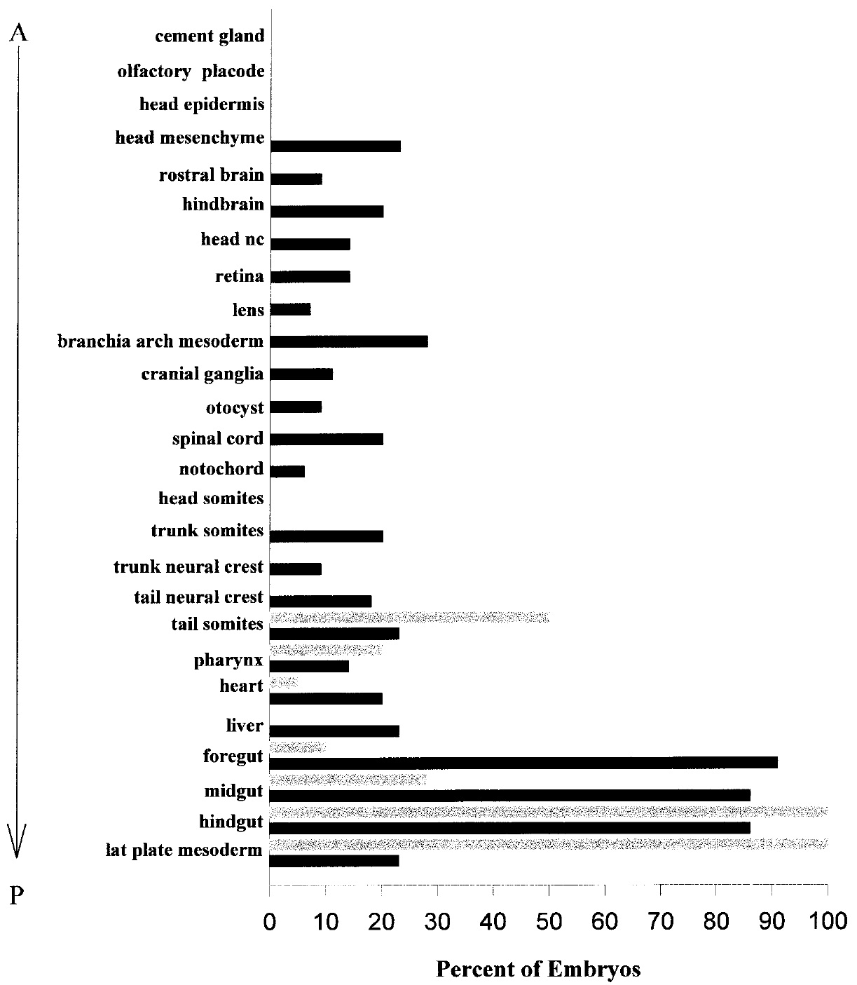 cerberus-injected (black bars) embryos. The percentage of embryos containing V2.1.1 progeny in a particular tissue is plotted. A total of 42