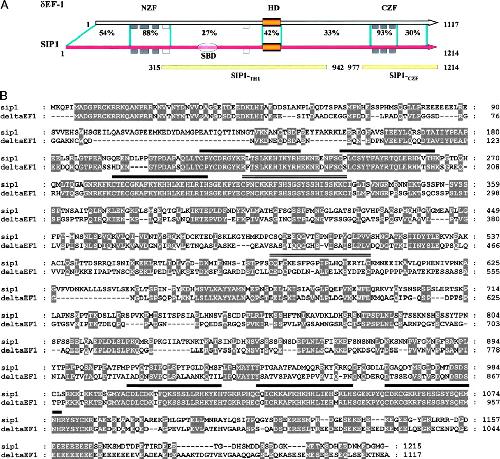 FIG. 2. A, schematic representation of the domain structure of SIP1 protein and its similarities with mouse dEF1. The putative zinc fingers are