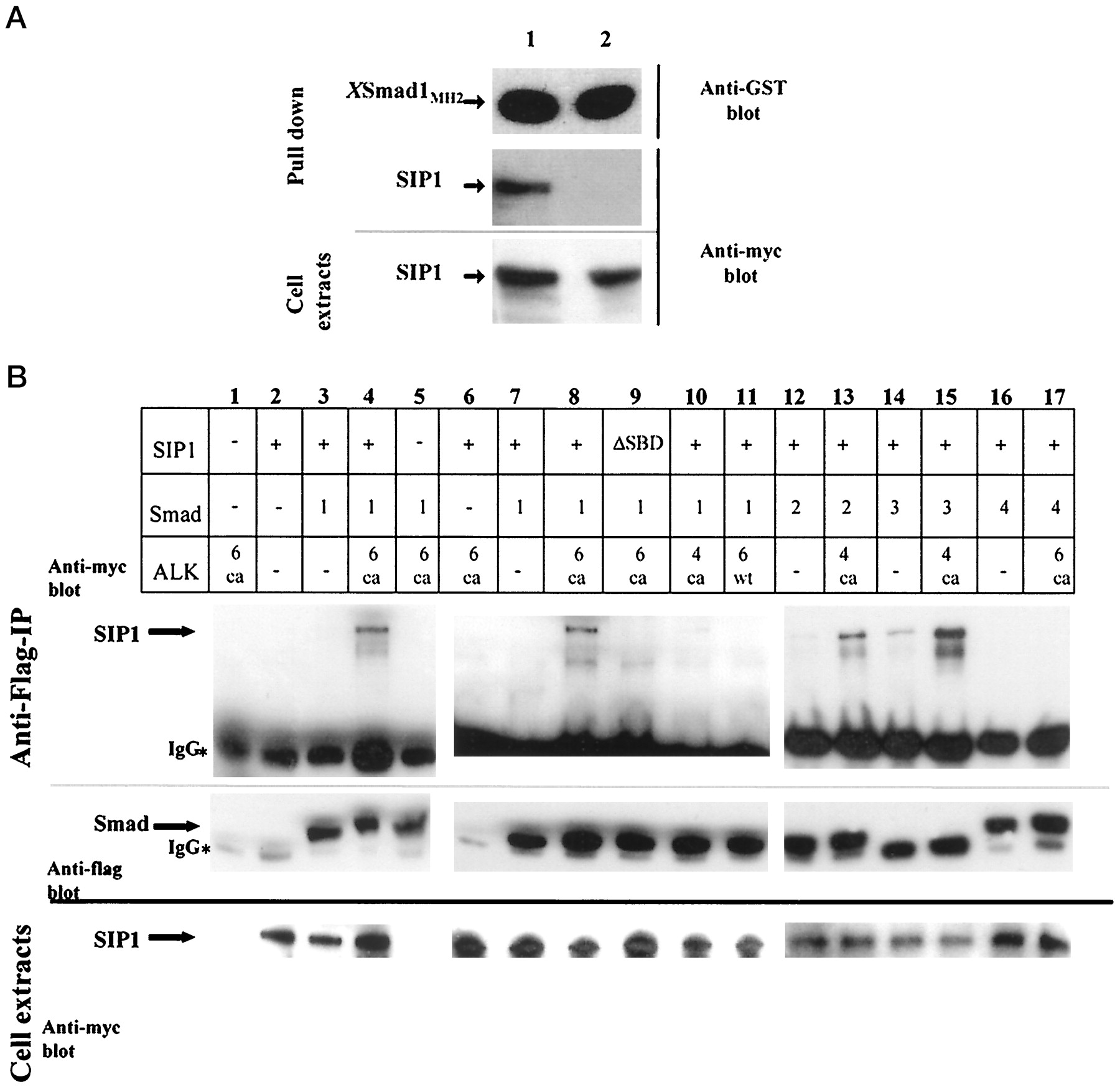 cell extracts using monoclonal anti-myc antibody (lower panel), respectively. B, ligand-dependent interaction of SIP1 with full-length Smads in