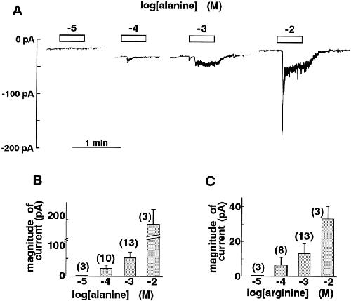Figure 6. Inward currents in response to alanine of varying concentrations (A). Responses from different neurons were recorded. Mean magnitude of inward currents in response to alanine (B) and arginine (C) of varying concentrations. Each point is the mean ± SEM of data obtained from n preparations that responded to any of the amino acids applied. The holding potential was −70 mV.