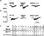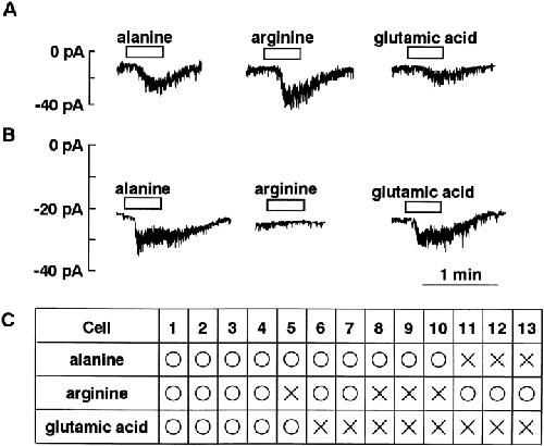 Figure 7. Inward currents in response to 100 μM alanine, 100 μM arginine, and 100 μM glutamic acid (A), and those to 1 mM alanine, 1 mM arginine, and 1 mM glutamic acid (B). All responses to each of the three traces were recorded from the same neurons. The holding potential was −70 mV. (C) Response profile of single olfactory neurons to various odorants of 1 mM as obtained by the whole-cell clamp technique. The ○ and × indicate an inward current and no current, respectively, upon the application of odorants.