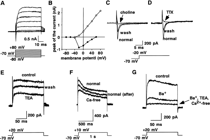 Figure 3. (A) The currents seen under voltage-clamp conditions in response to negative and positive voltage pulses from –70 mV. (B) Current–voltage relations. The peak of the transient inward current (•) and the outward current (○). Isolated Na+ currents from olfactory neurons in the lateral diverticulum. The voltage-activated Na+ current is blocked after the substitution of Na+ with choline in the external solution (C) or the addition of 1 μM TTX to the external solution (D). The internal solution contained (mM): 115 CsCl, 2 MgCl2, 2 EGTA, 10 HEPES-NaOH, pH 7.4. The external EGTA solution contained (mM): 116 NaCl, 4 KCl, 1 MgCl2, 1 EGTA, 10 glucose, 10 HEPES-NaOH, pH 7.4. Isolated K+ currents in olfactory receptor neurons in the lateral diverticulum of Xenopus laevis, and the effect of the application of TEA and the elimination of Ca2+ (E–H). (E) The K+ current responses to positive voltage pulses from a holding potential of −70 mV. This current was reversibly blocked by 25 mM TEA (F and G). The external solution contained (mM): 116 N-methyl-d-glucamine, 1 EGTA, 2 CoCl2, 10 glucose, 10 HEPES-KOH, pH 7.4. (H) The outward K+ current is partially attenuated by the elimination of Ca2+ from the external solution. The Ca2+-free solution contained (mM): 116 NaCl, 4 KCl, 1 MgCl2, 1 EGTA, 10 glucose, 10 HEPES-KOH, pH 7.4.