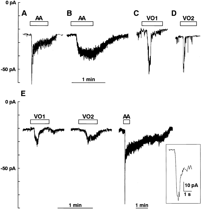 Figure 4. Inward currents in response to the amino acid cocktail (A and B). Inward currents in response to volatile odorant cocktail I (C) and cocktail II (D). All responses were recorded from different neurons (A∼D). (E) Inward currents in response to volatile odorant cocktail I, volatile odorant cocktail II, and the amino acid cocktail, respectively. The same inward current in response to the amino acid cocktail was shown with a short time scale in inset. All responses were recorded from the same neuron (E). The holding potential was −70 mV.
