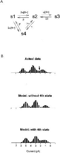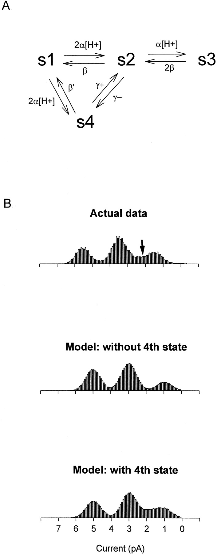 Figure 9. Model of WT channel behavior including both Type B and Type C modes of protonation. (A) The model includes four conductance states, s1–s4. s1 is the highest conductance state (65–70 pS) and occurs when no proton is bound to the channel pore. s2 (40–45 pS) occurs when one of the independent and equivalent carboxyl-carboxylate sites is occupied by a proton, and s3 (15–20 pS) occurs when both carboxyl-carboxylate sites are occupied. s4 (∼20–25 pS) occurs when a proton binds to the pore in the alternate, Type C, mode. The rate of proton binding is assumed to be diffusion limited for both modes of protonation. The pKa for the Type B carboxyl-carboxylate sites is taken to be 7.6, while the pKa for the Type C site is estimated to be ∼6.25. Concerted transitions can occur between s4 and s2 and are represented by the rate constants γ+ and γ−. Model parameters (explained more fully in the text): . Gaussian noise was added to the modeled channel transitions to construct realistic amplitude histograms. The model simulations were performed using a Microsoft QuickBASIC program implemented on a personal computer. (B) Comparison of model simulations with WT channel data. (Top) Amplitude histogram calculated from the activity of a single WT channel recorded at pH 7.6 with 130 mM NaCl on both sides of the membrane (the holding voltage was −80 mV). WT channels visited current levels between the low- and middle-conductance states more often than expected, giving rise to extra density in this part of the amplitude histogram (arrow). (Middle) Amplitude histogram generated from the model with s4 omitted. (Bottom) Histogram generated from the model with s4 included. Inclusion of s4 can reproduce the extra density seen in WT amplitude histograms, suggesting that a second mode of protonation is needed to fully explain WT channel behavior.