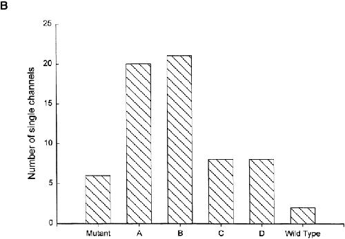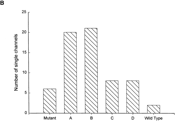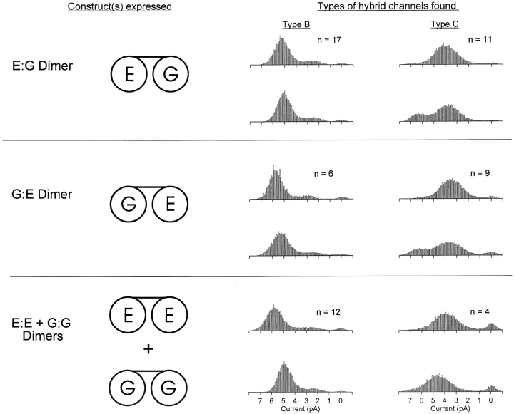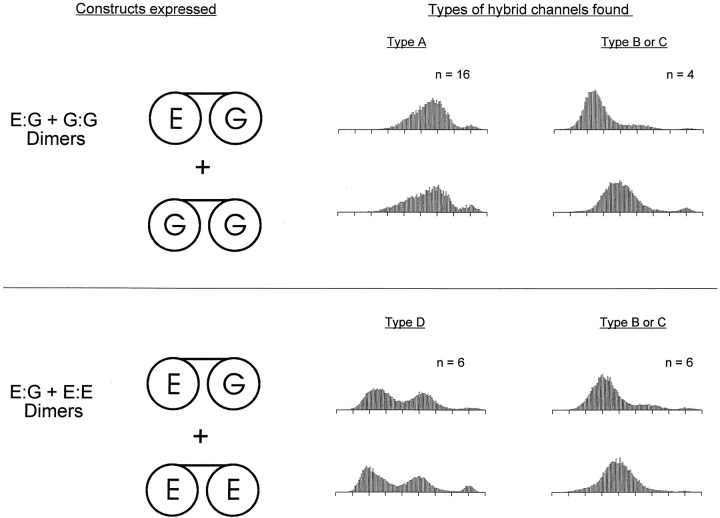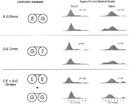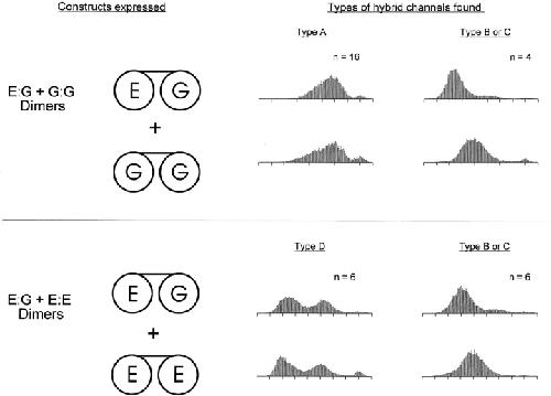 Figure 7. Expression of a mixture of the E:G and G:G dimers gave rise to Types A, B, and C, but never Type D, channels. Expression of a mixture of the E:G and E:E dimers gave rise to Types B, C, and D, but never Type A, channels. Examples of the measured hybrid channel types are given along with the total number of each type observed. Amplitude histograms were computed from single-channel currents recorded in inside-out patches at a holding potential of −80 mV. The intracellular and extracellular solutions contained 130 mM NaCl, pH 7.6.