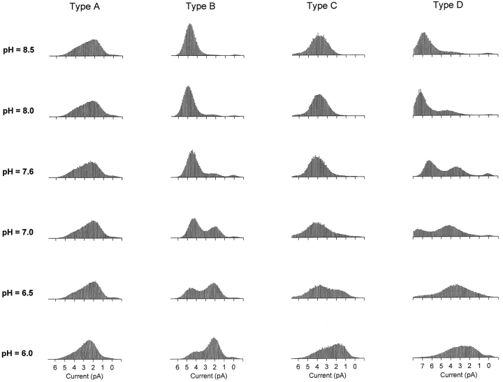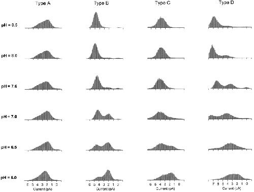 Figure 3. pH dependence of the hybrid CNG channels formed by coexpression of WT and E333G subunits. Amplitude histograms were compiled from single-channel currents recorded from outside-out patches with 130 mM NaCl on both sides of the membrane. Holding potential: −80 mV. The extracellular pH was varied by means of an array of capillary tubes (see materials and methods). For each channel type, all of the histograms in the figure were compiled from the same channel. Type A channels showed only a slight dependence on extracellular pH, while Types B, C, and D channels were strongly pH dependent. In particular, the Type B channel had two distinct conductance states at all pH values tested and switched smoothly from the high-conductance (∼50–65 pS) to the low-conductance (∼25–40 pS) state as the pH was lowered.