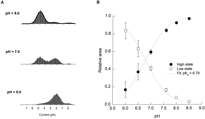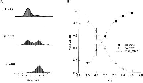 Figure 4. The pH dependence of the Type B hybrid CNG channel is consistent with there being a single protonation site. (A) Type B amplitude histograms (obtained from single-channel outside-out patches at a holding potential of −80 mV with 130 mM NaCl on both sides of the membrane) were compiled at different values of extracellular pH and fitted to a sum of three Gaussian functions, corresponding to the high and low conductance states and the closed state. Amplitude histograms collected from the same channel at pHo 8.0, 7.0, and 6.0 are shown along with the three-Gaussian fit at pHo 8.0 (solid line). The relative area under the low- and high-state Gaussian peaks was used as a measure of the probability of occupancy of each state as a function of pHo. The intracellular pH was 7.6. (B) The relative area under the Gaussian functions corresponding to the high and low conductance states was plotted as a function of pH, along with a fit to a model in which the probability of occupying the low conductance state depends on protonation at a single site (dotted lines). In the model, . The fit gives a pKa for the protonation site of 6.79.