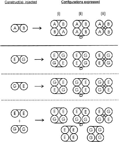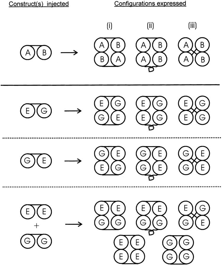 Figure 6. The results of expressing CNG channel dimers can be explained if the dimers can form tetrameric channels in three ways (top): (i) symmetrically, with the A and B protomers of the dimers across the channel from each other; (ii) asymmetrically, with the A and B protomers adjacent to each other; or (iii) with the two protomers of each dimer across the channel from one another. This scheme predicts that two (and only two) hybrid species should be formed when the E:G dimer, the G:E dimer, or a mixture of the E:E and G:G dimers are expressed, as observed experimentally. The two hybrid species, Types B and C, are each predicted to contain exactly two WT and two E333G subunits, with the WT subunits oriented across the channel from each other in one case and adjacent to each other in the other.