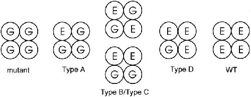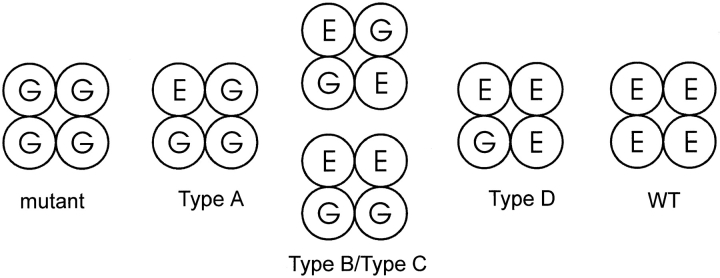 Figure 8. Identities of the six types of channels observed after expression of a mixture of WT and E333G CNG subunits, as deduced through dimer expression. Hybrid channel Types A and D can be assigned to specific structures: Type A has one WT subunit and three Glu333Gly subunits, while Type D has three WT subunits and one Glu333Gly subunit. Types B and C each have two WT and two E333G subunits, although it cannot be determined which channel type has two adjacent WT subunits (Type B/Type C, bottom) and which has two WT subunits opposite one another (Type B/Type C, top).