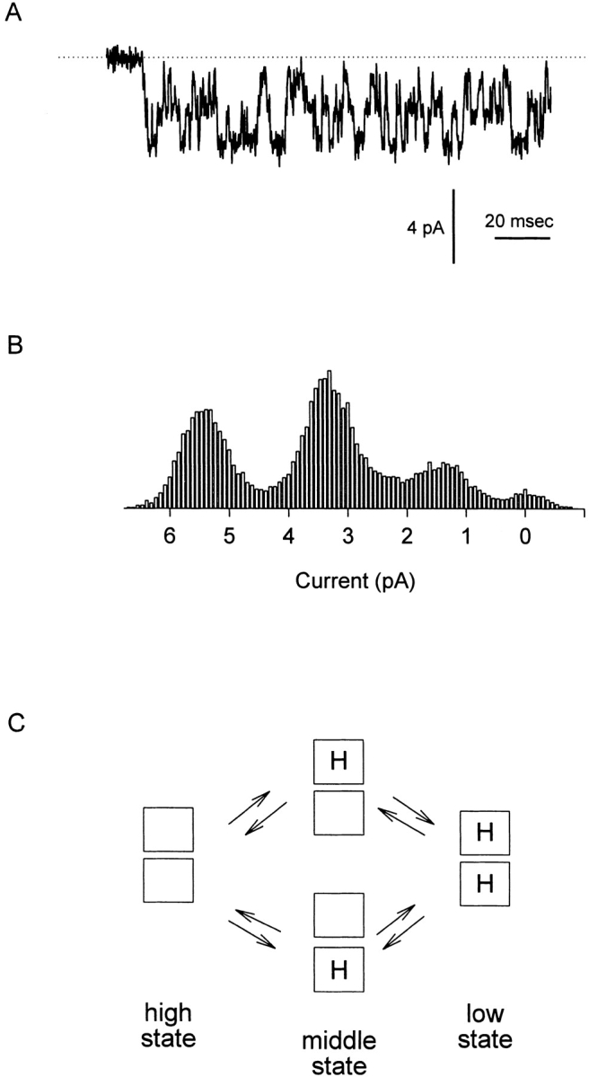Figure 1. The wild-type catfish olfactory cyclic nucleotide–gated channel has three conductance states whose occupancy is governed by protonation at two independent and equivalent sites in the channel pore. (A) Single-channel record showing the activity of a WT catfish olfactory CNG channel. The current was recorded from an inside-out patch held at −80 mV and exposed to 130 mM NaCl, pH 7.6, on both sides of the membrane. Recording solutions were prepared using 2H2O to slow transitions between the three conductance levels. (B) Amplitude histogram compiled from the activity of the WT channel shown in A showing the three distinct conductance levels visited by the channel (∼70, ∼42, and ∼18 pS). (C) Model introduced by Root and MacKinnon 1994 to explain quantitatively the behavior of the wild-type channel. In the model, four pore glutamate residues (one per subunit) combine to form two independent and equivalent protonation sites affecting ion permeation. The channel occupies the 70-pS conductance state when neither site is protonated, the 42-pS conductance state when either one of the sites is protonated, and the 18-pS conductance state when both sites are protonated.