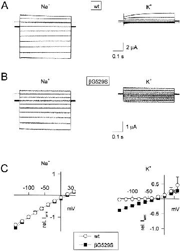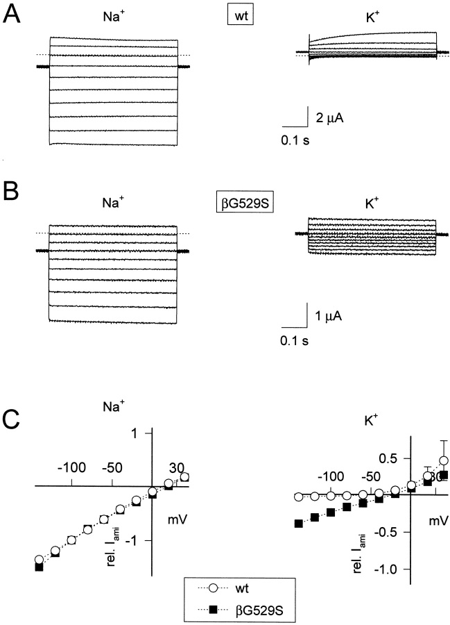 Figure 3. The βG529S mutant is partially permeable to K+. (A and B) Current traces of ENaC wt (A) and the βG529S mutant (B) in 40 mM Na+ or 120 mM K+ solution from two-electrode voltage-clamp recordings in Xenopus oocytes. Currents were measured during 500-ms voltage steps from a holding potential of −20 mV to test potentials of −140 to +40 mV in 20-mV increments. Currents measured in the presence of amiloride were subtracted from currents measured in the absence of 300 μM amiloride, and these subtracted currents are shown. The dotted line indicates zero level of the amiloride-sensitive current. (C) The current–voltage relationship of amiloride-sensitive Na+ and K+ currents obtained as described above are shown for wt and βG529S. For each oocyte, the amiloride-sensitive current was normalized to the INa at −100 mV. INa at −100 mV was 7.8 ± 2.4 μA for wt .