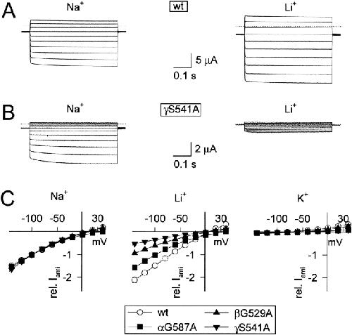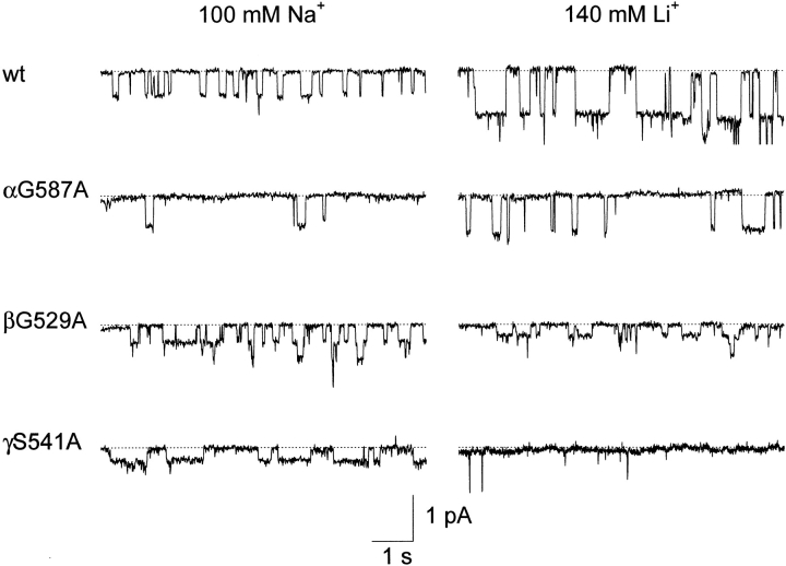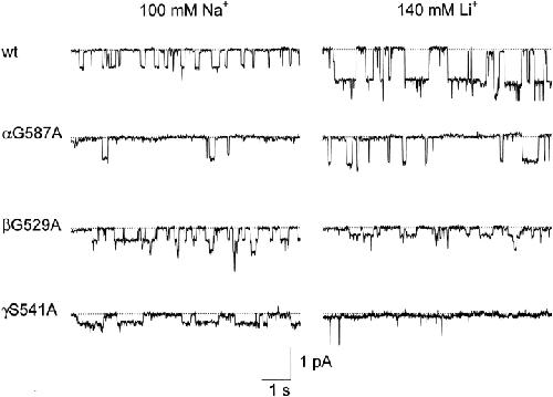 Figure 4. Single-channel Li+ and Na+ currents of wt ENaC and the mutants αG587A, βG529A, and γS541A. Traces are from outside-out patches from Xenopus oocytes at a holding potential of −100 (wt, γS541A) or −120 (αG587A, βG529A) mV at 100 mM external Na+ or 140 mM external Li+. The outside-out configuration was chosen to verify amiloride sensitivity of channel activity.