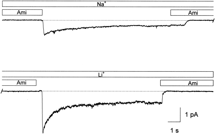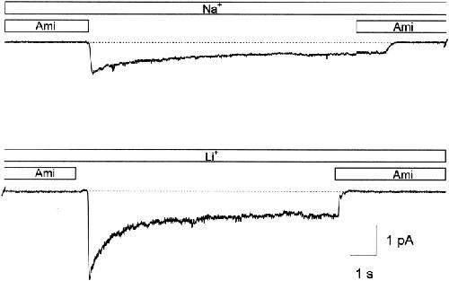 Figure 5. Amiloride-sensitive currents in macropatches from oocytes expressing the βG529S mutant. Subsequent application of extracellular Na+ and Li+ solution with and without 250 μM amiloride to an outside-out patch from an oocyte expressing βG529S ENaC. The holding potential was −80 mV.
