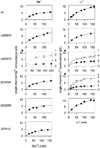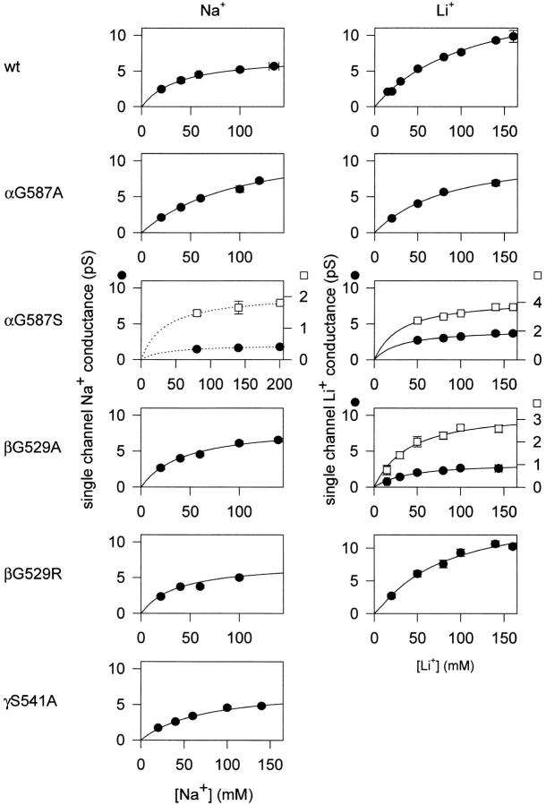 Figure 7. Saturation of single-channel conductance with increasing concentration of the permeant ion. Single-channel conductance from outside-out patches from oocytes is plotted versus the extracellular Na+ or Li+ concentration. Conductance was measured from a linear fit to single-channel currents at −70, −100, and −130 mV (wt, αG587A, βG529R) or −90, −120, and −150 mV (βG529A, γS541A). Each data point is from at least three different patches. In many cases, the error bars (SEM) are not visible because they are smaller than the symbol. Solid lines are the predictions by the energy barrier models (Table and Fig. 9). For Na+ permeation through αG587S, the dotted lines represent a fit to the Michaelis-Menten equation. For some mutants, conductance is also shown (□) on an expanded scale, indicated on the right hand ordinate.