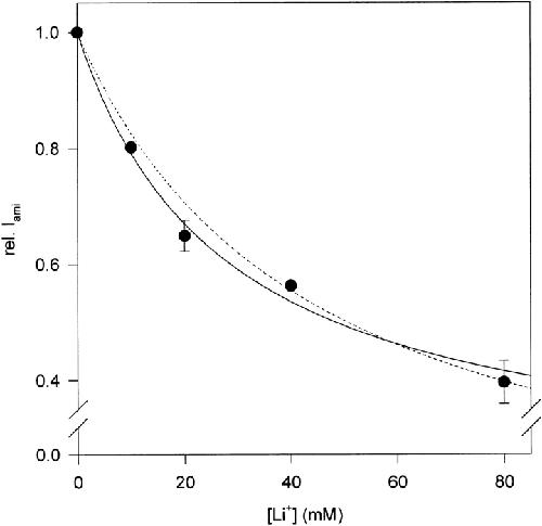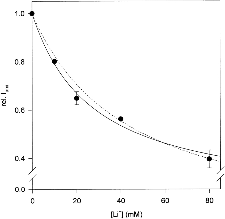 Figure 8. Block of Na+ current through γS541A ENaC by increasing concentrations of external Li+. Data are from outside-out macropatch recordings at a holding potential of −150 mV from Xenopus oocytes expressing γS541A. The bath solution contained 20 mM Na+ and increasing concentrations of Li+. The amiloride-sensitive currents were normalized to the condition without Li+ yielded an apparent Ki of 28 mM and is shown as a solid line. The prediction by the 3B2S model (see Table and methods) is shown as a dotted line.