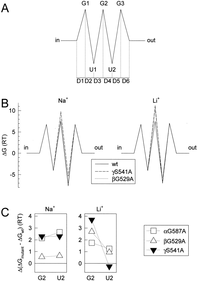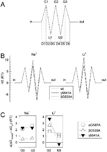 Figure 9. Energy barrier models of Na+ and Li+ permeation through open wt or mutant ENaC. (A) Parameters of the 3B2S model are represented and include: peak energies (G1-G3), well energies (U1, U2), and electrical distances (D1–D6). (B) Energy diagrams are drawn according to best-fit parameter values for the 3B2S model listed in Table . Profiles for wt (solid line), βG529A (dotted line), and γS541A (dashed line) are shown. (C) The ΔG changes relative to wt (Δ[ΔGmutant − ΔGwt]) of G2 and U2, the free parameters in the model fitting, are shown for αG587A, βG529A, and γS541A.
