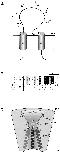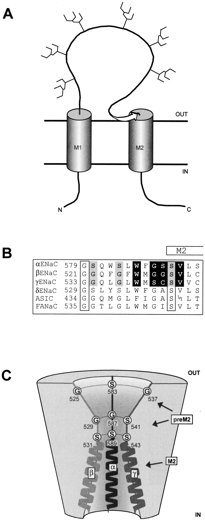 Figure 1. Sequence alignment and structural model of the pore region of ENaC. (A) Linear model of an ENaC subunit showing two transmembrane domains, M1 and M2, with a pre-M2 segment. (B) Sequence alignment of the pre-M2 segments of α, β, γ, δ ENaC, the ASIC family, and FANaC (FMRFamide peptide–gated Na+ channel; Waldmann et al. 1995a) (Waldmann and Lazdunski 1998; Tavernarakis and Driscoll 1997). The number of the first residue shown of rat α, β, γ ENaC, human δ ENaC, rat ASIC1, and FANaC is indicated. The putative start of M2, as predicted by the PHDhtm (transmembrane helix location) program at EMBL-Heidelberg, is indicated. The amino acid residues shown are identical within subunits across the species. Amino acid residues shown in open boxes are conserved across all known genes of the ENaC family. Amino acids analyzed in this study are shown in white on a dark background. Amino acids whose function has been analyzed in previous studies are shown in bold on gray background. αS583 and the homologous amino acid residues βG525 and γG537 change channel affinity for amiloride block (Schild et al. 1997). αS589 is a determinant of the geometry of the narrowest part of the pore (Kellenberger et al. 1999). (C) The cross-section shows the pre-M2 segments and the second putative transmembrane α-helices (M2) of an α subunit (black, center), a β subunit (gray, on the left) and a γ subunit (dark gray, on the right). The second α subunit located on the side of the viewer (Firsov et al. 1998) is not shown. The outer vestibule is lined by the pre-M2 segment where amiloride binds to αS583 and the corresponding Gly residues in the β and γ subunit (Schild et al. 1997). The vestibule narrows down to the selectivity filter formed by αG587, βG529, and γS541 residues and the ring of Ser residues (αS589 and analogues; Kellenberger et al. 1999).