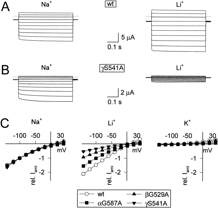 Figure 2. The macroscopic Li+/Na+ conductance ratio is decreased by mutations of homologous residues in α, β, and γ subunits. Current–voltage relationship of amiloride-sensitive currents in two-electrode voltage-clamp recordings from Xenopus oocytes. (A and B) Current traces of ENaC wt (A) and the γS541A mutant (B) in 40 mM Na+ or Li+ solution. Currents were measured during 500-ms voltage steps from a holding potential of −20 mV to test potentials of −140 to +40 mV in 20-mV increments. Currents measured in the presence of amiloride were subtracted from currents measured in the absence of 5 μM amiloride, and these subtracted currents are shown. The dotted line indicates zero level of the amiloride-sensitive current. (C) Current–voltage relationship in 40 mM Li+, 40 mM Na+, or 120 mM K+ bath solution from oocytes expressing wt, αG587A, βG529A, and γS541A mutant ENaC are shown. Recordings were obtained as described in A and B, with the exception that 250 μM amiloride was used to block βG529A currents. For each oocyte, the amiloride-sensitive current was normalized to the INa at −100 mV. INa at −100 mV was 13.9 ± 2.3 μA for wt .
