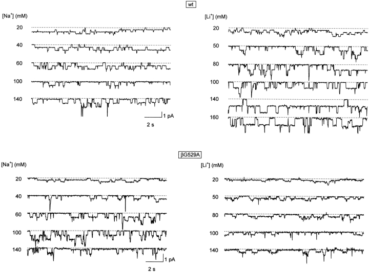 Figure 6. Ion concentration dependence of unitary currents of ENaC wt and βG529A. Single-channel recordings from outside-out patches from Xenopus oocytes at holding potentials of −130 (wt) or −150 (βG529A) mV in either Na+ or Li+ solutions. The numbers on the left side of the traces indicate the extracellular concentration of the permeant ion. Pipette solution was CsF/N-methyl-d-glucamine (see methods).