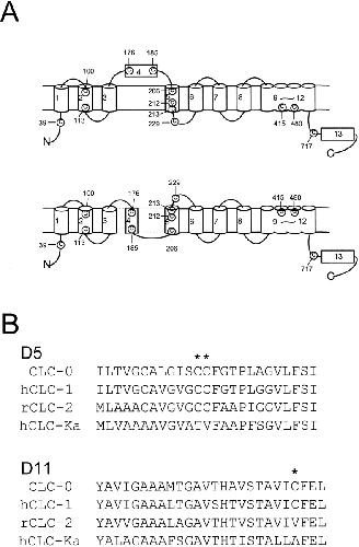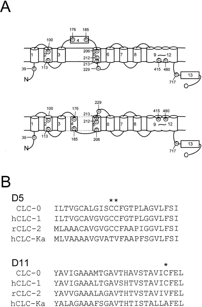 Figure 1. (A) Positions of cysteine residues of ClC-0. The membrane topology of the top panel was drawn according to Schmidt-Rose and Jentsch 1997, whereas the bottom panel was drawn according to Fahlke et al. 1997. Placing the D8–D9 linker in intracellular side (bottom), however, violates the fact that there is a glycosylation site in this linker (Middleton et al. 1994). (B) Alignment of the amino acid sequences of D5 and D11 from several ClC channels. Stars on top of the sequences denote C212, C213 (in D5), and C480 (in D11) of ClC-0.