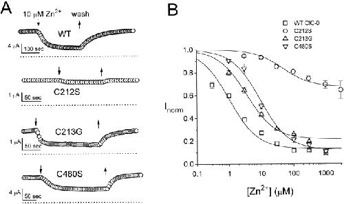 Figure 3. Sensitivity of wild-type ClC-0 and cysteine mutants to extracellular Zn2+ inhibition. (A) Inhibition by 10 μM extracellular Zn2+ on the steady state current of the wild-type channel (WT), C212S, C213G, and C480S. Down- and upward arrows indicate the application and washout of 10 μM Zn2+, respectively. Dotted lines represent zero-current level. (B) Dose-dependent inhibition of Zn2+ for the four channels shown in A. All data points were the average of 3–11 determinations. The current amplitude was normalized to the value right before the application of Zn2+. Solid curves were drawn according to a Langmuir function: , with values of K1/2 and I∞: (wild type) 1.0 μM and 0.87; (C212S) 47.5 μM and 0.33; (C213G) 3.5 μM and 0.78; (C480S) 9.3 μM and 0.88.
