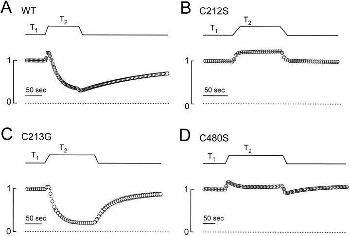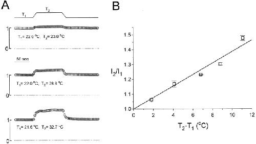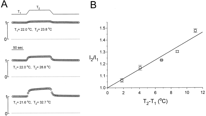 Figure 5. Temperature dependence of the macroscopic current of C212S. (A) Temperature-jump experiments showing different degrees of the increase in the steady state current. All current amplitudes are normalized to the value of the first point and the dotted lines are the zero-current level. All data points were from the average of four measurements. (B) Temperature-dependent increase of the whole oocyte current. I1 was measured right before the increase of the temperature, whereas I2 was measured near the end of the temperature jump. The solid line is the best fit to a linear equation . Data points were from the average of four to six measurements.