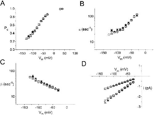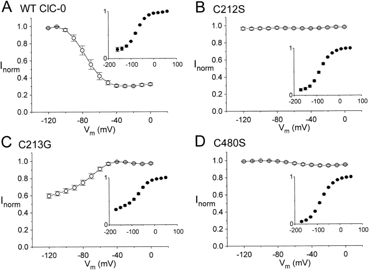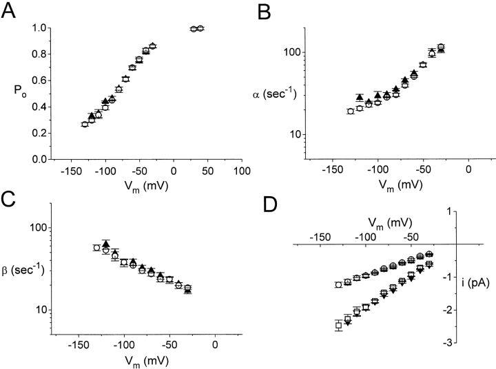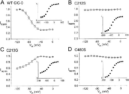 Figure 9. Comparison of single-channel properties of wild-type ClC-0 and C212S. The parameters of the fast gate were calculated from and the single-channel current amplitudes were measured from all-points amplitude histograms. (A) Steady state voltage dependence of the open probability of the fast gate. (B) Opening rate constants of the fast gate as a function of membrane potential. (C) Closing rate constants of the fast gate. (D) Single-channel I–V curves. ○ and ▴ are the current amplitudes of one-pore opening, whereas □ and ▾ are those of two-pore openings. In all panels, solid symbols represent wild-type ClC-0, whereas open symbols are C212S.