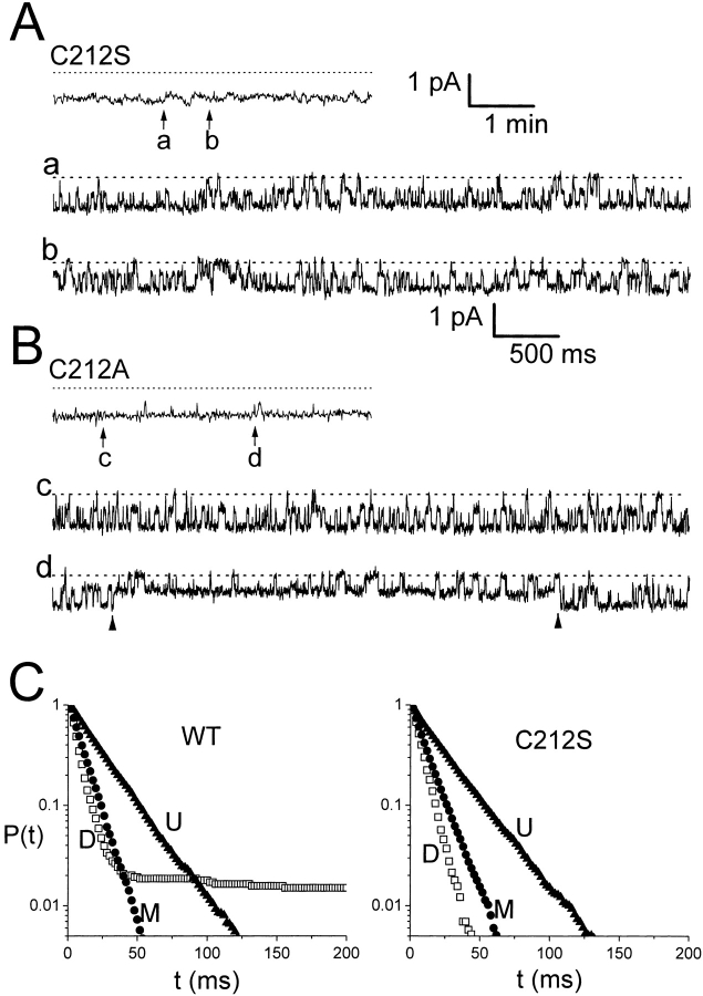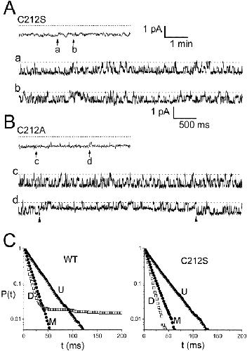 Figure 7. (A and B) Single-channel recordings of C212S and C212A. Continuous recording for 5 min in each case at a holding potential of −50 mV. The top of each panel is in a compressed time window. a–d are the recordings starting at the indicated points (arrows) with an expanded time window. The scale bars for the compressed and expanded time windows in A also apply to B. No inactivation event was discernible in both A and B throughout the whole recordings. Temperature was ∼23–24°C. (C) Comparison of cumulative dwell-time distributions of the events at conductance levels D (□), M (•), and U (▴) between wild-type ClC-0 (left) and C212S (right). The recording trace of the wild-type channel used for analysis is the same as the 4-min trace in Fig. 6 A. For C212S, the analyzed trace is the first 4-min recording shown in A. All events in each of the three levels were used for analysis. The numbers of events in levels D, M, and U are: (wild type) 1,399, 7,009, and 5,612; and (C212S) 1,731, 7,822, and 6,092, respectively.