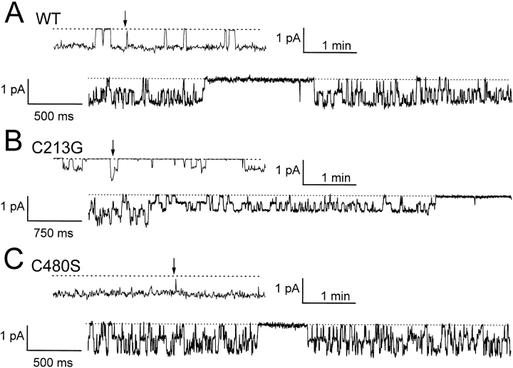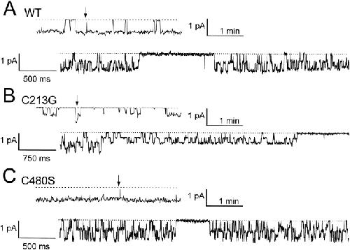 Figure 6. Single-channel recordings of (A) Wild-type ClC-0, (B) C213G, and (C) C480S. Continuous recording from excised inside-out patch at a holding potential of −50 mV. The top of each panel shows a 4-min recording in a compressed time window. The bottom is with an expanded time window starting at the position indicated by the arrow. Note that two C213G channels were present in the patch. The temperature during recording was ∼23–25°C.
