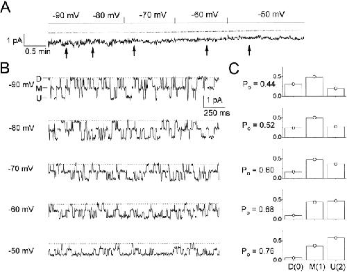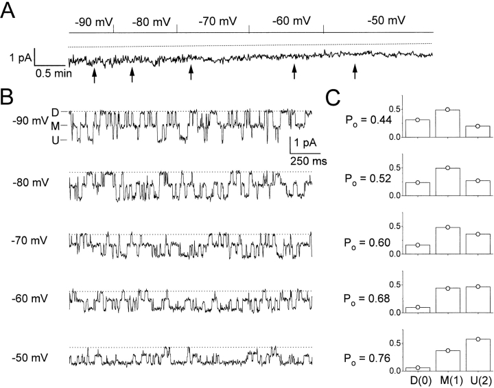 Figure 8. Binomial distribution of the three current levels in C212S. (A) Continuous 6-min single-channel recording trace at various membrane voltages. Same channel as the one shown in Fig. 7 A. The recording at −50 mV corresponds to the first ∼100-s recording in Fig. 7 A. (B) Representative 2-s recording traces starting at the positions indicated by arrows in A. (C) Open probability of the fast gate (Po) and the probabilities of the three current levels, fD, fM, and fU, at membrane potentials from −90 (top) to −50 (bottom) mV. The analysis was made on the corresponding regions shown in A, with the length of each segment being: 44 s (−90 mV), 62 s (−80 mV), 70 s (−70 mV), 72 s (−60 mV), and 106 s (−50 mV). The measured state probabilities, fD, fM, and fU, are represented by bars, whereas ○'s denote f0, f1, and f2, the predicted values of state probabilities calculated from Po.