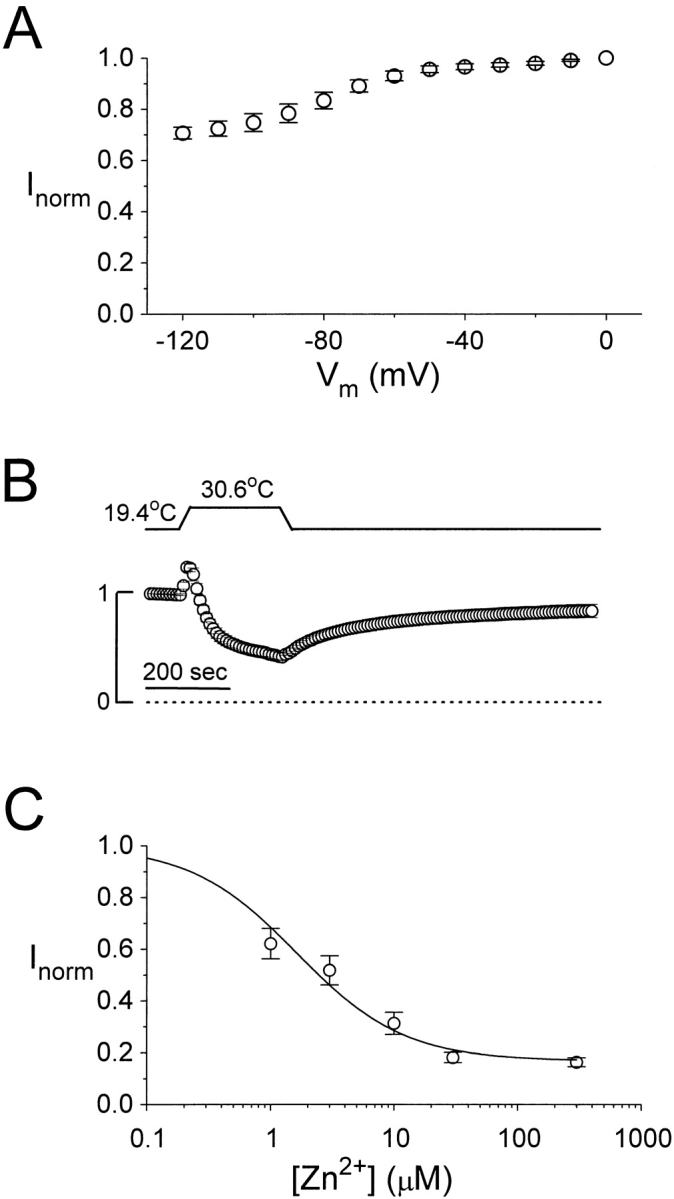 Figure 10. Probing the slow gate of S123T. (A) Quasi–steady state activation curve off the slow gate. (B) Temperature dependence of the macroscopic current from the whole oocyte. (C) Dose-dependent inhibition of the channel by extracellular Zn2+. The solid curve is drawn according to the Langmuir function described in Fig. 3, with K1/2 and I∞: 1.72 μM and 0.85 .