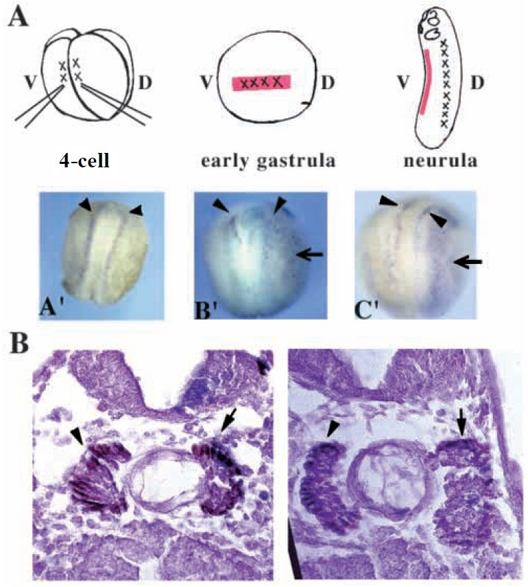 the injected (arrow) and uninjected (arrowhead) side of each embryo