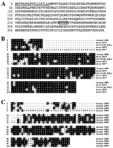 Fig. 1. Xenopus GDF6 is a close homolog of GDFs and BMPs. (A) Sequence of the