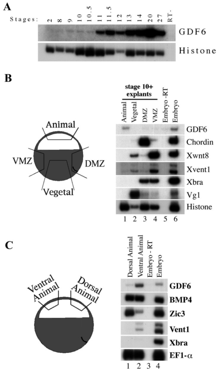 Fig. 4. Spatial expression of GDF6 during early Xenopus development. (A) GDF6