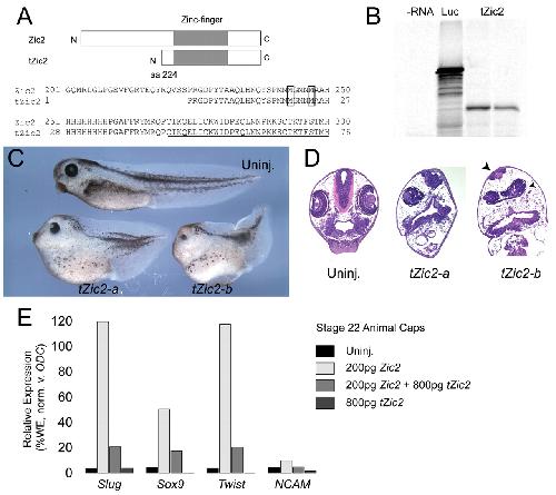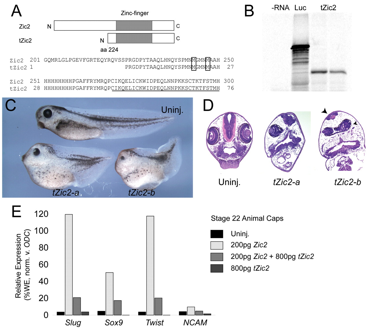 Fig. 1. Isolation and dominant-interfering activity of a truncated Zic2 cDNA. (A) Upper panel: diagram showing the Xenopus Zic2 protein compared with the tZic2 protein. Lower panel: partial alignment of the amino acid sequences of the full-length and truncated-Zic2 proteins. Two potential starting methionines are boxed. The start of the zinc-finger domain is underlined. (B) In vitro translation of tZic2. Two preparations of tZic2 plasmid were translated in transcription-translation coupled reactions. Luciferase (Luc), â¼50 kDa. (C) Injection of tZic2 causes microcephaly and cyclopia. Uninjected and tZic2-injected (500 pg) embryos at stage 40. (D) Hematoxylin and Eosin stained sections from the embryos in C showing reduced forebrains (large arrowhead) and abnormal or cyclopic eyes (small arrowhead). (E) Real-time RT-PCR analysis of neural crest (Slug, Sox9, Twist) and neural (NCAM) marker expression in animal caps cultured to stage 22. Samples and amounts injected are indicated in the key. Relative expression values; samples were normalized to ODC and expressed as a percentage of a whole stage 22 embryo sample.