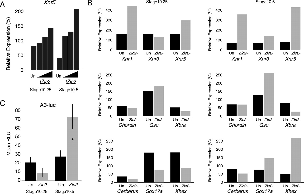 Fig. 3. Zic2 regulates Xnr expression during gastrulation. (A) Dose-dependent induction of Xnr5 by injected tZic2 RNA (330 pg, 660 pg, 990 pg) in whole embryos assayed by real-time RT-PCR. Un, uninjected embryo. (B) Expression of Xnrs, mesoderm and endoderm markers in control (Un) and Zic2-depleted (Zic2-; 5 ng oligo 10MP) embryos assayed by real-time RT-PCR at stage 10.25 (left panel) and stage 10.5 (right panel). (C) Increased activin-like activity in Zic2-depleted embryos. Mean relative luciferase units (RLU)=A3-luciferase activity (3Ã activin response element)/RLTK (Renilla luciferase, thymidine kinase promoter) activity. Error bars show s.d. in a representative experiment; the asterisk indicates statistical significance (P<0.05).