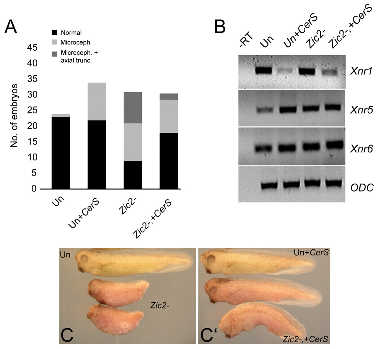 Fig. 6. Rescue of Zic2-depletion by injection of CerS. (A) Analysis of microcephaly (microceph.) and axial truncations (axial trunc.) in control stage 33 embryos (Un), controls injected with 50 pg CerS mRNA (Un+CerS), Zic2-depleted embryos (Zic2-) or Zic2-embryos injected with 50 pg CerS mRNA (Zic2-, +CerS). Data were pooled from two host-transfer experiments. Bars represent the number of embryos with the indicated phenotype. Axial truncations were present in a subset of embryos with microcephaly. (B) Expression of Xnr1, Xnr5 and Xnr6 in gastrula (stage 10.5) stage embryos analyzed by RT-PCR. (C,Câ²) Examples of embryos from the experiment in B. Zic2-embryos show both microcephaly and axial truncation; the Zic2-, +CerS embryos represent a normal and a microcephalic embryo (upper and lower embryo, respectively).