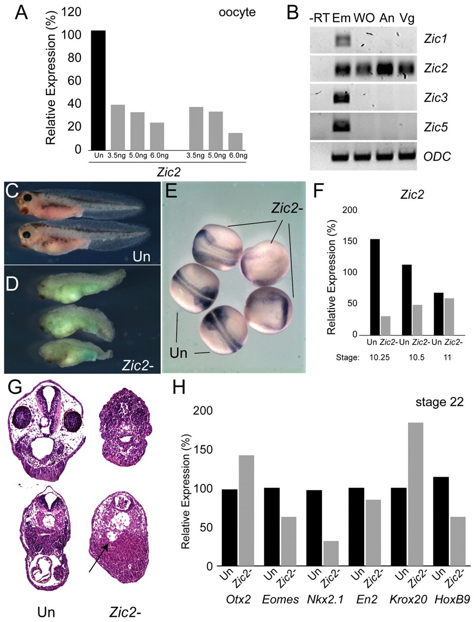 Fig. 2. Depletion of maternal Zic2. (A) Dose-dependent depletion of Zic2 from oocytes of two different donor females. Oligo 10MP was injected at the indicated doses and oocytes were cultured for 24 hours before analysis by RT-PCR. Samples were quantitated relative to uninjected oocytes (Un) from female 1 (black bar). (B) Zic2 is the only Zic gene expressed maternally. RT-PCR of Zic1, Zic2, Zic3 and Zic5 expression in stage 10.5 embryos (Em; stage 14 for Zic5), stage VI oocytes (WO) or animal and vegetal halves of oocytes (An and Vg). (C,D) Representative phenotypes of uninjected (C) and Zic2-depleted (D) embryos at stage 38/39. (E,F) Zygotic Zic2 is expressed in maternal Zic2-depleted embryos. (E) Whole-mount in situ hybridization of Zic2 expression in stage 18 uninjected (two lower left embryos) and maternal Zic2-depleted embryos (three upper right). Although neural tube formation is delayed, Zic2 is expressed anteriorly and at the neural plate border. (F) Gastrula stage series of Zic2 expression in uninjected and Zic2-depleted embryos. (G) Histological sections of embryos from C,D taken through the head (upper panel) or just behind the level of the otic vesicle (lower panel). In each panel, the uninjected embryo is on the left and the Zic2-depleted embryo is on the right. The arrow indicates a duplicated notochord. (H) Real-time RT-PCR analysis of neural markers in control and Zic2-embryos. Relative expression values were normalized to ODC and expressed as a percentage of a stage 22 embryo.