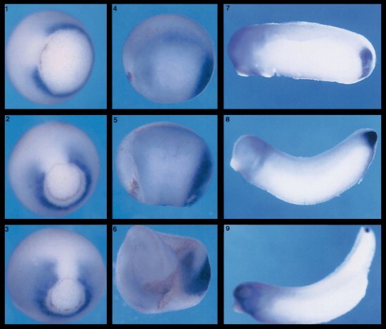 dorsal at the top and ventral at the bottom. Strong expression is evident in the tailbud and weak expression in the lateralmesoderm. (5) Stage 20. (6) Stage 25.