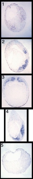 Fig. 4. Section in situ hybridization analysis. (1) A stage 10.5 section, oriented with the animal pole at the top and the vegetal pole at the bottom, shows Mespo expression in the lateralmesoderm cells at the endomesodermal border. Note that the blastopore lip is out of the plane of this section. (2) A stage 13 section, oriented with dorsal at the top and ventral at the bottom, with anterior to the left and posterior to the right. Mespo expression is excluded from the involuted dorsal mesoderm but dorsallateral, ventral-lateral, and ventral expression is seen in the mesodermal cells around the yolk plug. The cavity at the top is the archenteron and the cavity at the left is the blastocoel. (3) A stage 17 transverse section, oriented with dorsal at the top and ventral at the bottom, shows Mespo expression in the presomitic mesoderm; expression is not seen in the notochord or archenteron roof cells. (4) A stage 22 transverse section shows expression in the tail region. The cavity shown is the hindgut. (5) A sense control of a stage 10.5 embryo section.