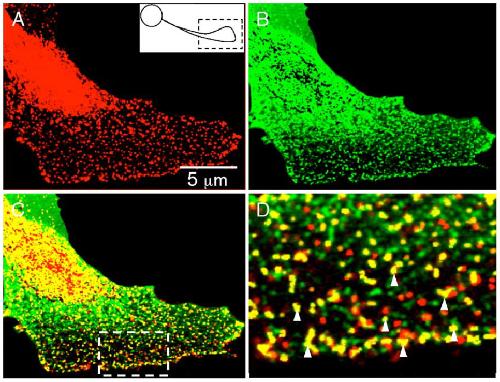 (D, boxed region in panel C) reveal that most of the red spots representing focal complexes are in register with green spots (yielding yellow), indicating close cell �